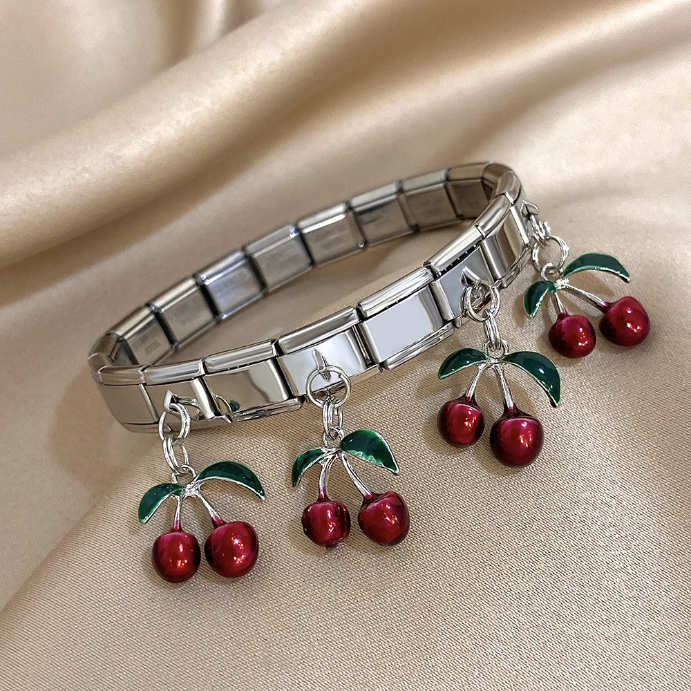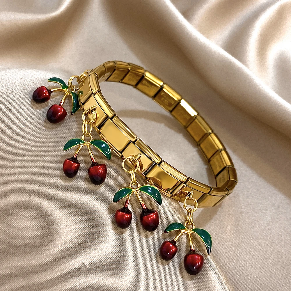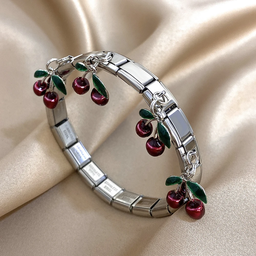 Fashion Italian Charm Links Stainless Steel Bracelet for Women Chic Plant Cherry Pendant Elastic Watch Strap Bangle Jewelry Gift